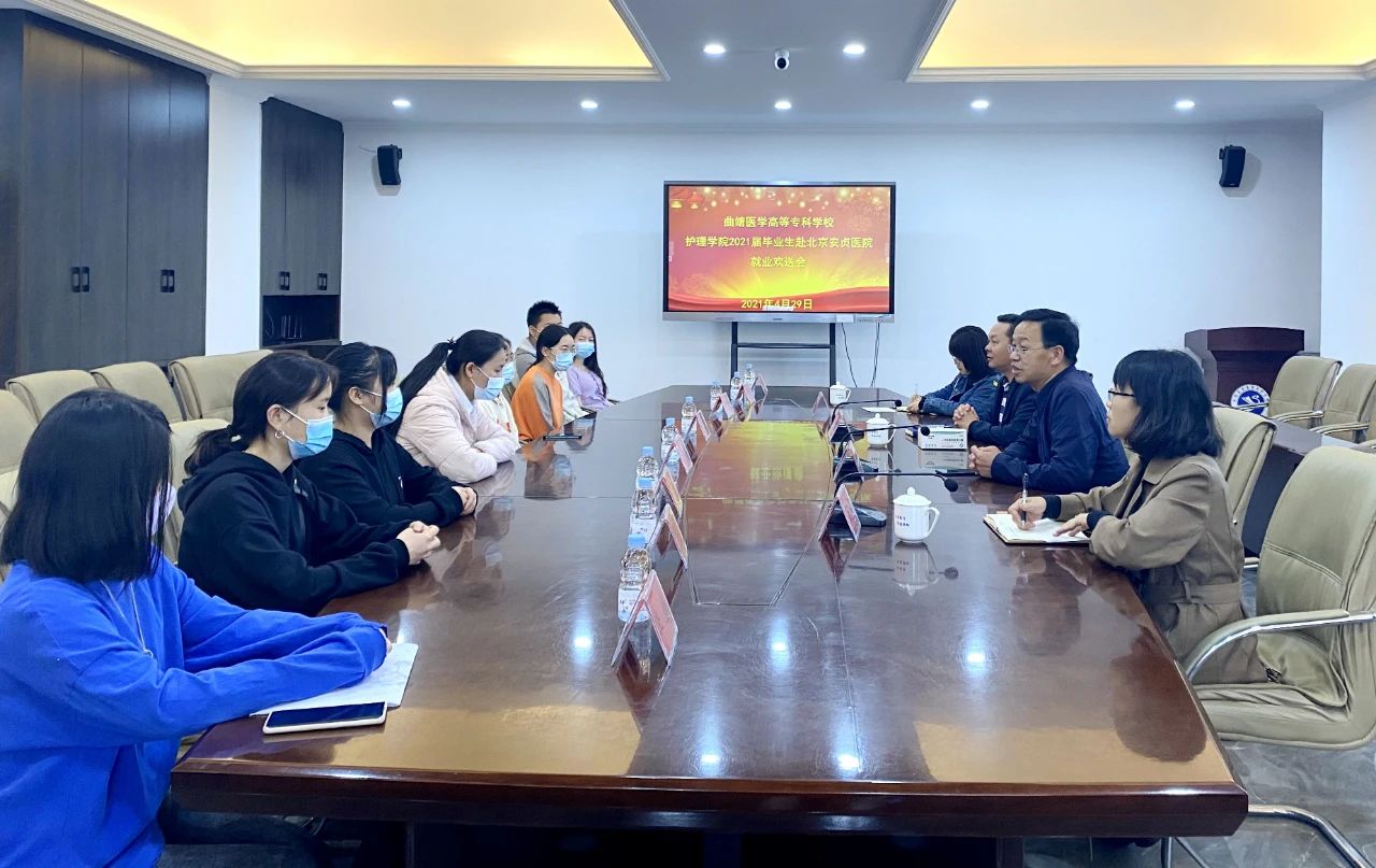 4月29日上午,在崇德楼一楼会议室举行曲靖医学高等专科学校护理学院2021届毕业生赴北京安贞医院就业欢送会,参加欢送会的有学校副校长陈正权、护理学院党总支书记王娟、护理学院院长王所荣、辅导员和10名即将赴北京就业的学生。