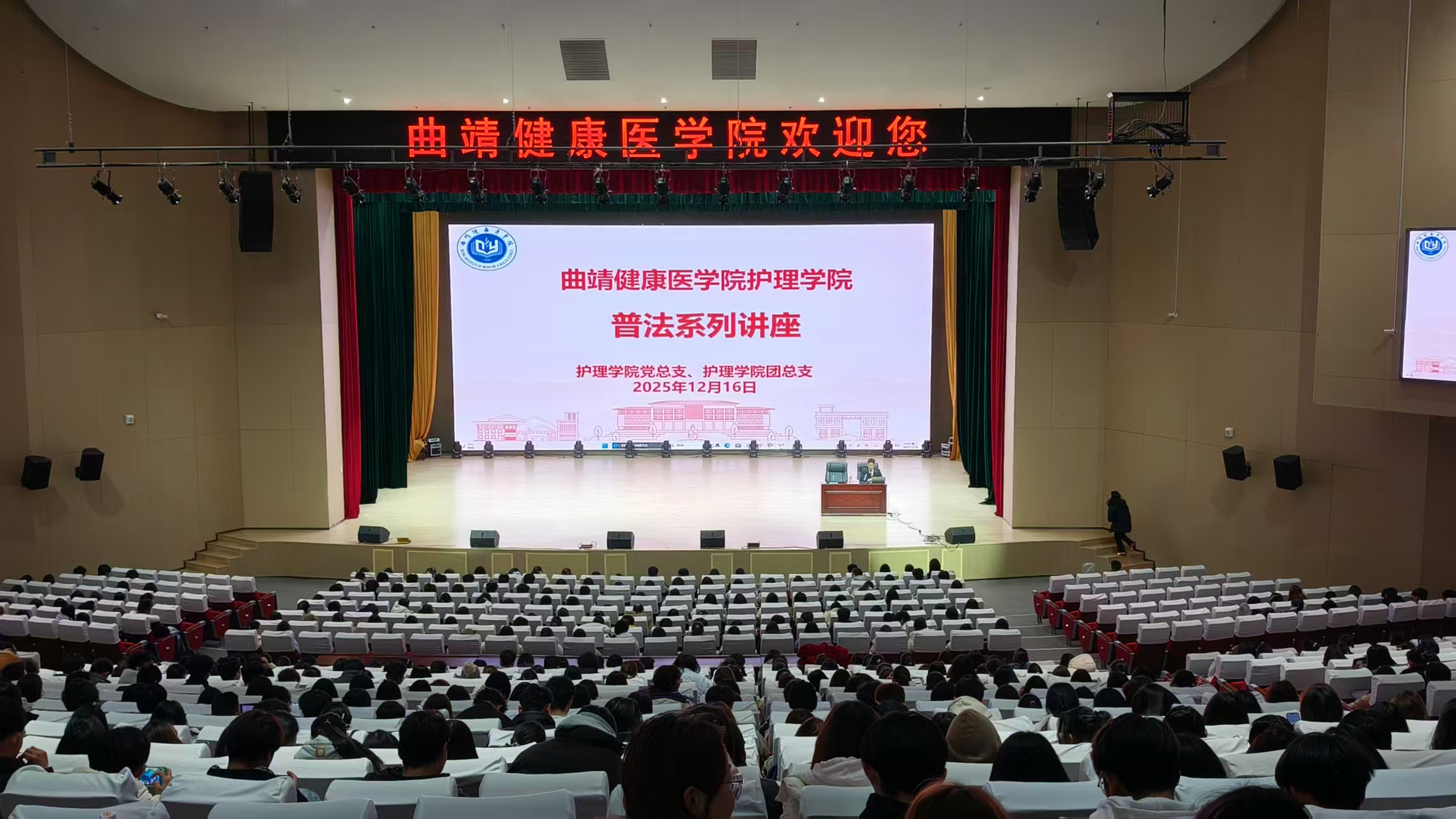 为强化师生法治观念,筑牢校园安全防线,12月16日下午,beat365英国官方网站护理学院于汇韵馆学生会堂开展普法系列讲座。活动特邀曲靖市马龙区人民法院干警担任主讲人,护理学院全体师生到场聆听学习。