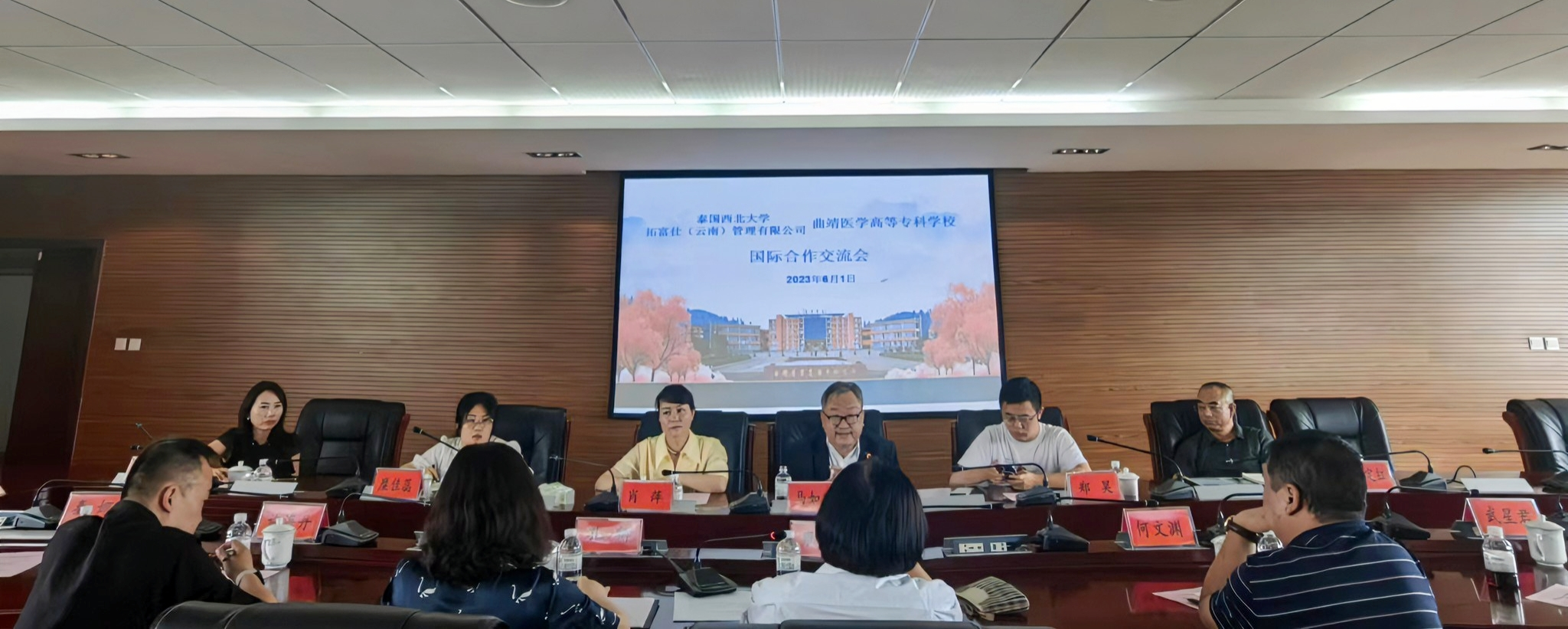 雍怡敏代表学校对泰国西北大学、拓富仕(云南)管理有限公司代表一行表示热烈欢迎,并详细介绍了我校的发展历程、特色专业等情况,希望各方以本次国际交流合作为契机,开展更广泛深入的办学交流,实现优势互补、互利共赢。马如宝介绍了泰国西北大学的基本情况及暑期研学、护理专业专升本等项目的情况,希望与学校开展深度合作,推动两校共同发展。肖萍在座谈中对校企三方合作模式、流程等事宜作具体说明。雍怡敏表示将会进一步加强师生参与国际合作项目的调研和动员,在护理、药学和中医学专业开展深层次的合作。会后,全体参会人员合影留念。