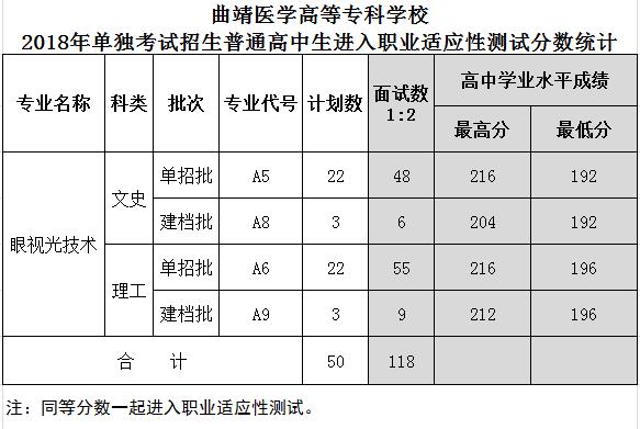 曲靖医学高等专科学校2018年单独考试招生普通高中生进入职业适应性测试分数统计及名单