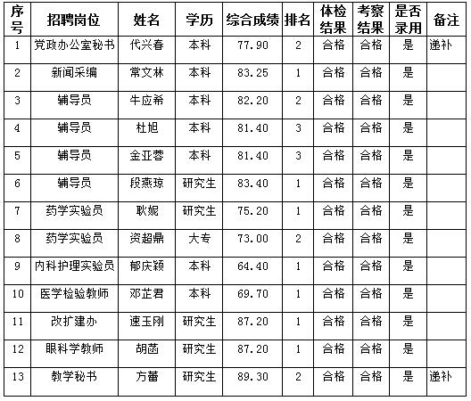 根据中共曲靖市委组织部 曲靖市人力资源和社会保障局《关于印发〈曲靖市事业单位公开招聘人员试行办法〉的通知》(曲人社〔2011〕55号)及《曲靖医学高等专科学校2017年公开招聘编制外工作人员公告》规定,现将曲靖医专2017年公开招聘招聘编制外工作人员体检、考察结果及拟录(聘)用人员名单公示如下(公示期为7个工作日):