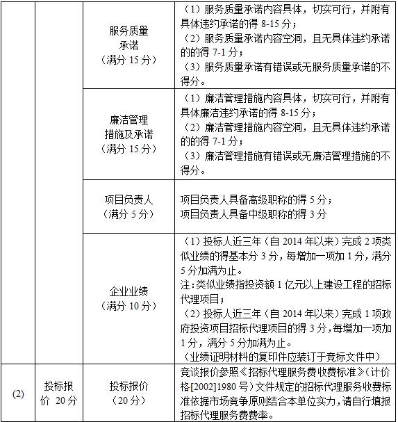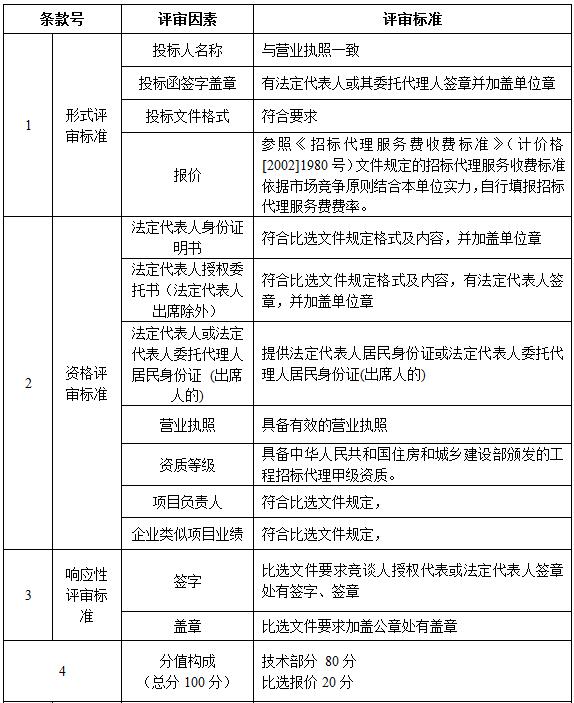 比选活动遵循公平、公正、优质、优价的原则,按照下表“评标办法”规定的方法、评审因素、标准和程序对竞谈文件进行评审。选取一家公司承担本项目招标代理服务。
