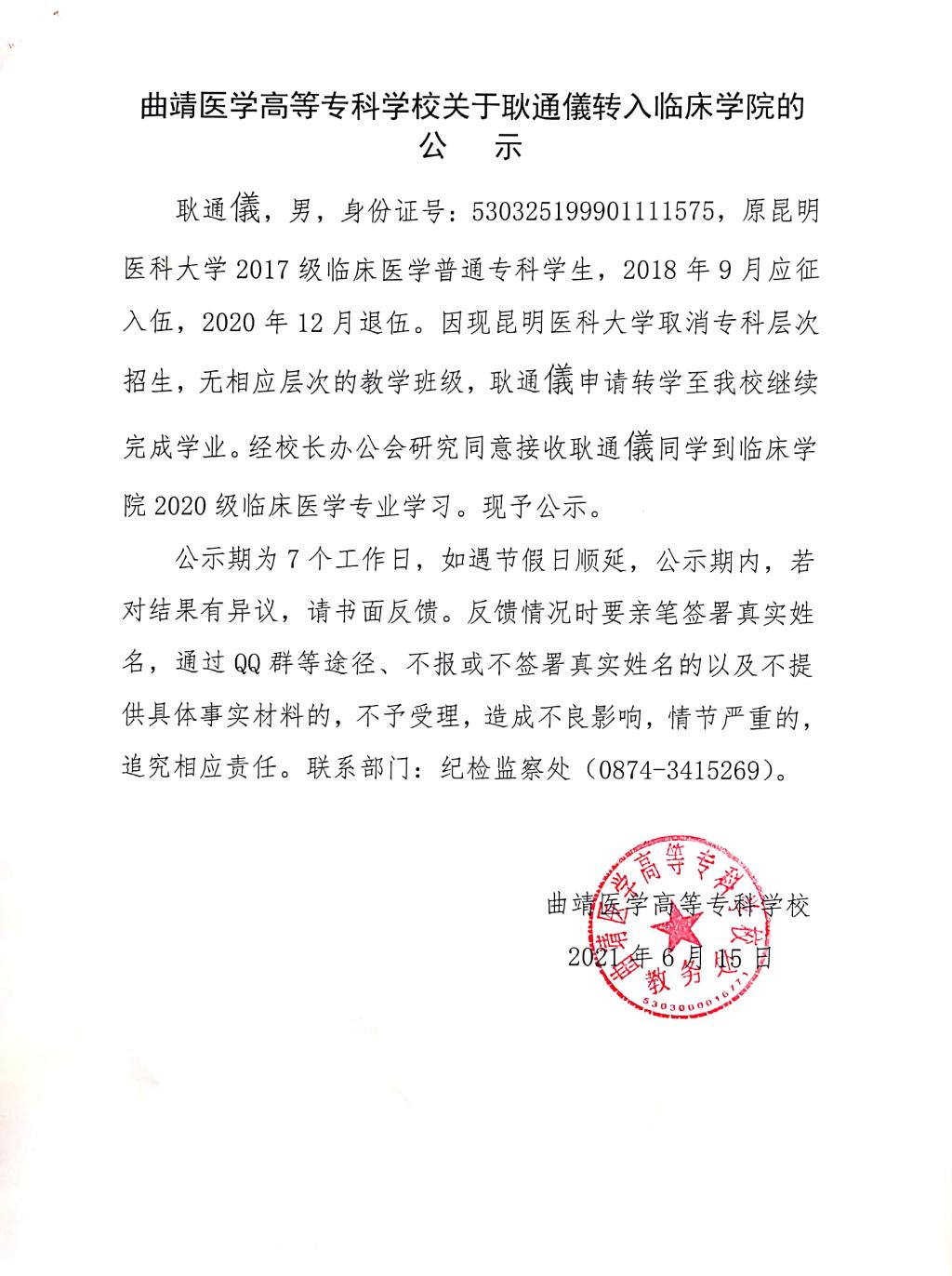 曲靖医学高等专科学校关于耿通儀转入临床学院的公示