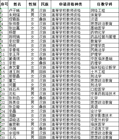 根据《云南省教育厅关于开展2024年高校教师资格认定工作的通知》要求,经网上报名、现场确认,共30名教师申请认定高等学校教师资格,现将名单公示如下,公示期为2024年5月9日至2024年5月14日,如有异议,请向人事处反映。