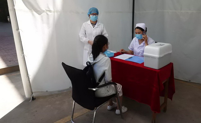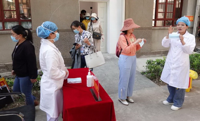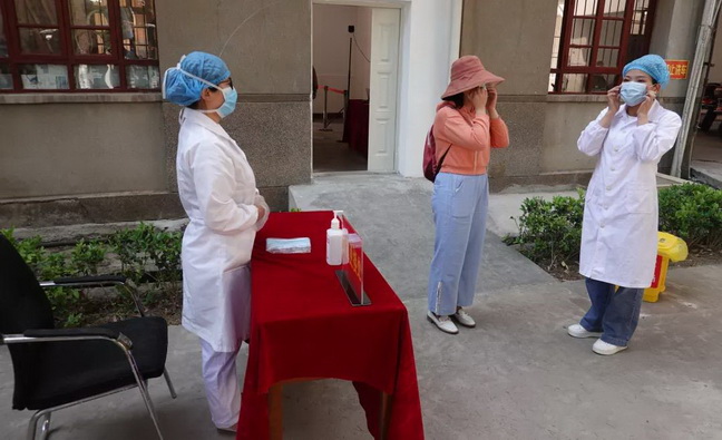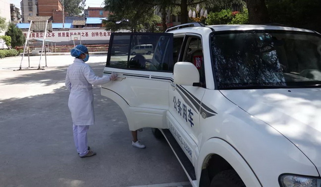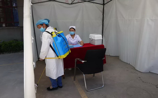 后勤人员对复测台进行消毒