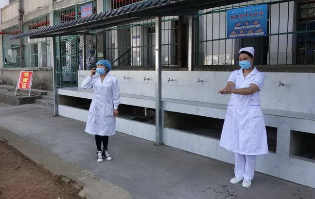 学校医护老师现场做了“正确佩戴口罩”“七步洗手法”“食堂就餐前体温检测”演示。