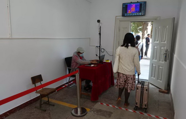 模拟人员依次通过体温检测通道