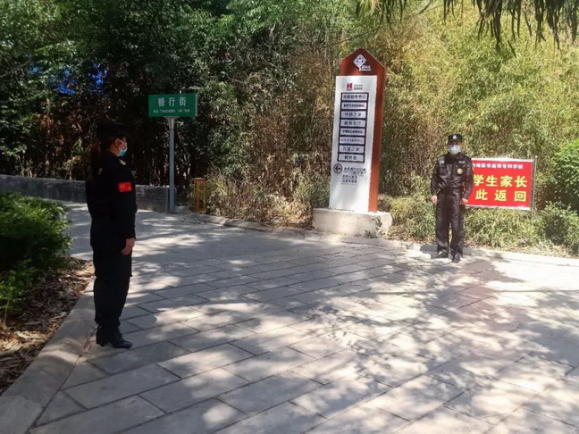 在模拟演练发现“新冠肺炎疑似病例”中,模拟演练的演职员(老师)乘自驾车到达学校门口指定区域后,有序排队进行“学生证”“健康码”检查,按标示到达专门区域手部消毒和行李消毒,再经过体温检测通道后更换新口罩,体温正常者通过指定通道有序进入学校。在体温检测过程中,模拟了发现一名38℃的新冠肺炎疑似病例,学校专职医护人员将患者带到复测台进行体温复测后送至隔离室观察,按照学校新冠肺炎防控应急处置工作要求逐级向上汇报,并做好各点位的消杀工作,最后由转诊专用车接送至医院。