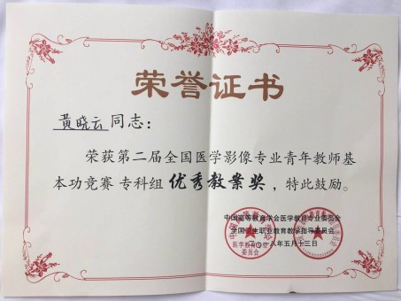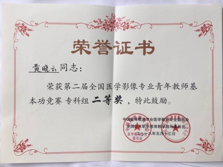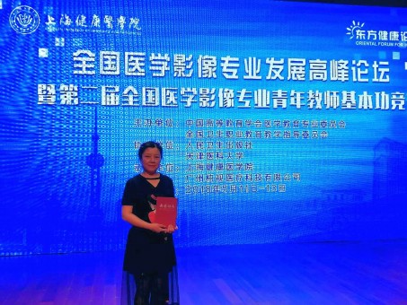 5月11-13日,由中国高等教育学会医学教育专业委员会、全国卫生职业教育教学指导委员会主办,天津医科大学、人民卫生出版社协办的2018年全国高等院校医学影像专业发展高峰论坛暨第二届全国医学影像专业青年教师基本功竞赛在上海健康医学院举行,此次竞赛分优秀教案竞赛和教师教学基本功竞赛。其中,优秀教案奖仅设四名,我校黄晓云老师在专科组优秀教案竞赛中脱颖而出,以总分第一名的成绩名列榜首,荣获“优秀教案奖”,在专科组教师基本功竞赛中,黄晓云老师发挥出色,荣获二等奖。