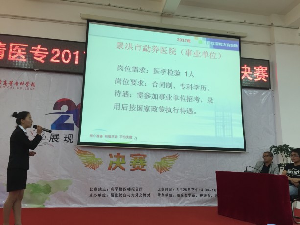 展现医者才能,塑造职业人生。2017年5月27日,曲靖医学高等专科学校举办2017年模拟招聘大赛决赛。本次大赛旨在为学生提供真实的职场演练,提升求职技巧与能力,提早适应职场氛围。