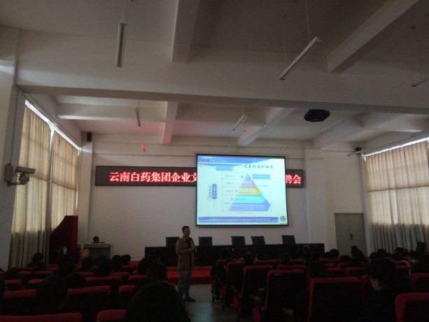 2017年4月14日下午一点,在学校典学楼418报告厅,云南白药集团进行企业文化宣讲暨顶岗实习招聘会,招聘15级药学、药品经营与管理、药物制剂技术三个专业的实习生。云南白药集团股份有限公司,前身为成立于1971年 6月的云南白药厂。1996年10月经临时股东大会会议讨论,公司更名为云南白药集团股份有限公司。公司被评为“2009年全国国有企业典型”,是历次评选中唯一入选的云南企业和医药行业企业。2016年,第十届中国品牌价值500强榜单中云南白药集团排名第52名。2017年1月,中共中央政治局常委、国务院总理李克强在昆明深入考察了云南白药集团。