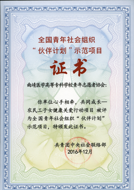 近日,由团中央、全国青联主办的2016年全国青年社会组织“伙伴计划”项目总结会在北京举行,曲靖医学高等专科学校选送的“心手相牵,共同成长——农民工子女健康关爱行动”项目被评为全国30个“示范项目”之一,成为全国高职高专院校的唯一入选者。