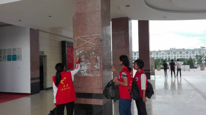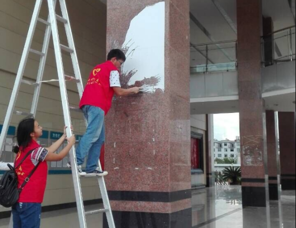 志愿者们将目标“锁定”在学校行政楼前门、典学楼大厅、各楼层过道及校园内的固定宣传栏等地方,按照区域分组行动,清除过期的通知、宣传海报、横幅、小广告和“牛皮癣”,针对部分顽固的对象,志愿者们还用上灰刀、清洁剂、药水等非常规清洁工具。同时,志愿者们还在全校范围内捡拾和清扫塑料袋、一次性饭盒、一次性筷子、纸屑等“白色垃圾”。经过为期三天的清理,学校的环境卫生得到了基本的改善,校园“牛皮癣”的数量明显减少。同时,志愿者美化校园环境的行为吸引了诸多同学们的关注,给大家留下了比较正面的印象,为爱护校园环境不乱扔垃圾树立了较好的榜样。有志愿者表示,“学校是我家,迎评促建靠大家”,我们希望通过志愿者的行动为评估做贡献,更重要的是以实际行动树立榜样,将“爱护校园环境,为评估争光添彩”的正能量传递给大家。