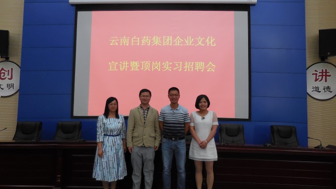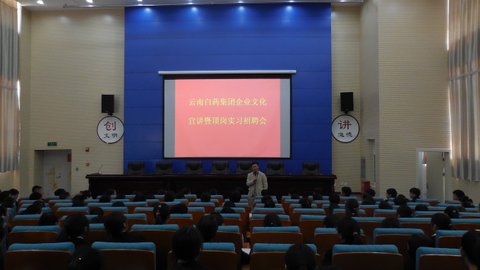 2016年4月14日下午两点半,在学校图书馆一楼报告厅,云南白药集团进行企业文化宣讲暨顶岗实习招聘会,招聘14级药学、药品经营与管理、药物制剂技术三个专业的实习生。云南白药集团股份有限公司,前身为成立于1971年 6月的云南白药厂。1996年10月经临时股东大会会议讨论,公司更名为云南白药集团股份有限公司。公司被评为“2009年全国国有企业典型”,是历次评选中唯一入选的云南企业和医药行业企业。