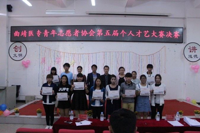 4月21日下午,由学校团委主办,青年志愿者协会承办的“曲靖医专青年志愿者协会第五届个人才艺大赛”在典学楼报告厅隆重举行。学校团委书记张磊、副书记王良玉、团委吴永春老师、方国敏老师、青年志愿者协会副会长马勇雄、张春梅出席本次比赛并担任评委。