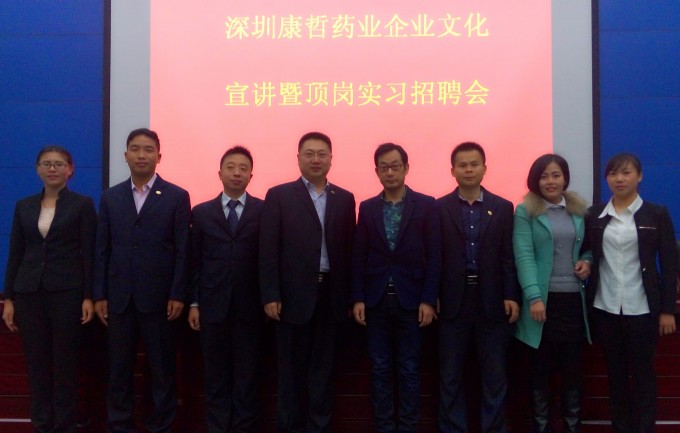 2016年3月25日晚上七点,在学校图书馆一楼报告厅,深圳康哲药业进行企业文化宣讲暨顶岗实习招聘会,招聘14级药学、药品经营与管理、药物制剂技术三个专业的实习生。深圳康哲药业是中国领先的专门从事营销、推广及销售处方药品的医药服务公司,按医院覆盖数量、治疗领域及销售人员数量计,深圳康哲药业营运中国国内最大的第三方推广网络。凭借其经验、知识及良好的往绩纪录,深圳康哲药业有能力帮助海外及国内的医药公司将他们的产品引进至中国市场。