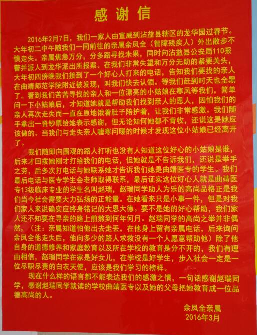 2月7日,一名50余岁的宣威籍智障人士余凤全来到曲靖,与家人外出时不慎走失, 2月9日流浪至曲靖市经济技术开发区瑞河公园附近遇到一名女孩,并向其求助,该女孩用电话帮助余凤全老人联系到家人,并陪同老人在寒风中等待4个多小时,直到其家人从宣威赶来并接走老人,余凤全家人非常感激女孩,当场硬要拿钱给女孩表示感谢,女孩说什么也不要,一再追问下只说自己是曲靖医专的学生便匆匆走了。接下来余凤全家人四处打听寻找女孩,几经周折找到临床医学党总支书记孔卿,请求帮助寻找该名女孩,经多方了解核实,该女孩是13级临床4班的学生赵瑞。