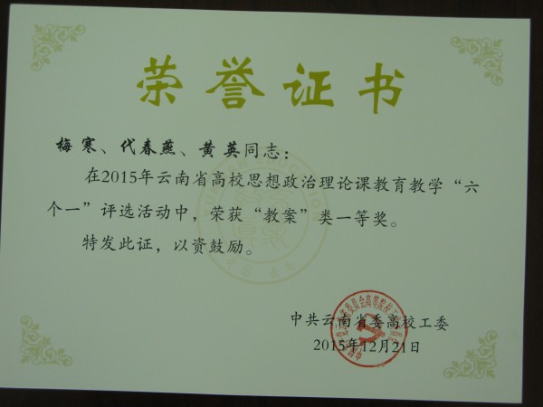 根据《中共云南省委高校工委关于开展2015年云南省高校思想政治理论课教育教学“六个一”征集评选活动的通知》(云高工函〔2015〕22号)要求,省委高校工委组织专家组对参评项目进行了分类评审,评选结果为一等奖29项,二等奖54项,三等奖101项。我校思政部申报的《< 毛泽东思想和中国特色社会主义理论体系概论>集体备课方案》荣获一等奖,《云南省扶贫开发与生态文明建设的新模式——曲靖市美丽家园建设调研报告》、《云南省大学生村官发展现状调查实践报告》和《思想道德修养与法律基础(集体备课教案)》荣获二等奖,《“教学做”一体化思政课实践教学——“概论”实践教育案例》、《曲靖中学教师压力状况和职业倦怠调研报告》、《思想道德修养与法律基础(教案)》、《思想道德修养与法律基础(教学示范片)》荣获三等奖。