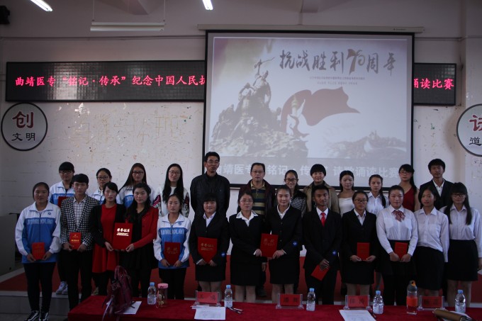 为深切缅怀抗战英烈,弘扬爱国主义精神和民族精神,展现我校学子对抗战英雄的怀念、追思和对世界和平的追求与珍惜。11月3日下午,曲靖医专2015年“铭记,传承”纪念中国人民抗日战争暨世界反法西斯战争胜利70周年诵读比赛在典学楼报告厅隆重举行。学校党委宣传部部长潘辉、学生处副处长倖涛、团委副书记李玥昊、思政部基础教研室主任王鸣、学生处杨蕊担任评委。各系参赛选手、亲友团等260余人参加了本次大赛。