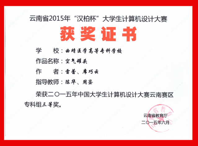 我校选送的两件作品参加了这项赛事的角逐,由2013级卫生信息管理班杨杰等同学主创的《中医心 师德情》和2013级临床5班雷蕾等同学主创的《空气罐头》获得评委们的认可,均顺利获得三等奖。