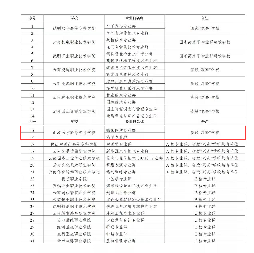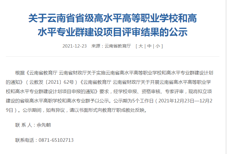昨日,云南省教育厅官网发布《关于云南省省级高水平高等职业学校和高水平专业群建设项目评审结果的公示》,我校被确定为云南省“双高校”建设单位。
