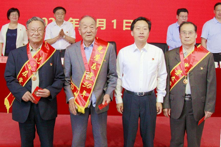 党委书记余祖林为党龄50年的老党员颁发“光荣在党50年”纪念章,并向获得纪念章的老党员表示热烈的祝贺和崇高的敬意!