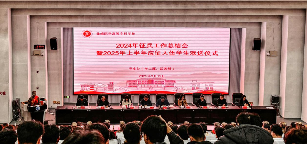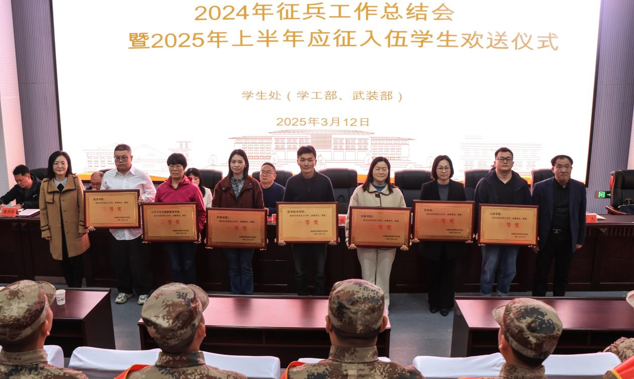 3月12日上午,学校2024年征兵工作总结会暨2025年上半年应征入伍学生欢送仪式在典学楼举行。学校党委副书记桂发权,党委委员、统战部部长、招生就业与对外交流处处长孔卿、学校征兵工作相关部门、各学院党总支负责人、辅导员、2022级班主任以及退役复学、本次应征入伍和在校学生代表参加会议。会议由学生处(学工部 武装部)处长乔艳永主持。
