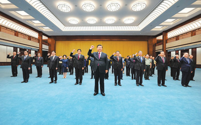 6月18日,党和国家领导人习近平、李克强、栗战书、汪洋、王沪宁、赵乐际、韩正、王岐山等在中国共产党历史展览馆参观“‘不忘初心、牢记使命’中国共产党历史展览”。这是参观结束后,习近平带领党员领导同志一起重温入党誓词。(新华社记者 李学仁摄) |