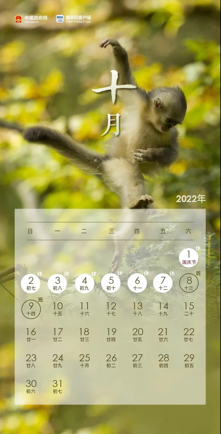 七、国庆节:10月1日至7日放假调休,共7天。10月8日(星期六)、10月9日(星期日)上班。