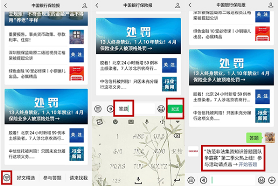 已关注的用户发送关键词"答题"到公众号后台,点击自动 回复中的"开始答题",即可进入活动页面。(答题过程中如 遇试卷失效,重新发送关键词"答题"到公众号后台,即可获取最新活动链接。)