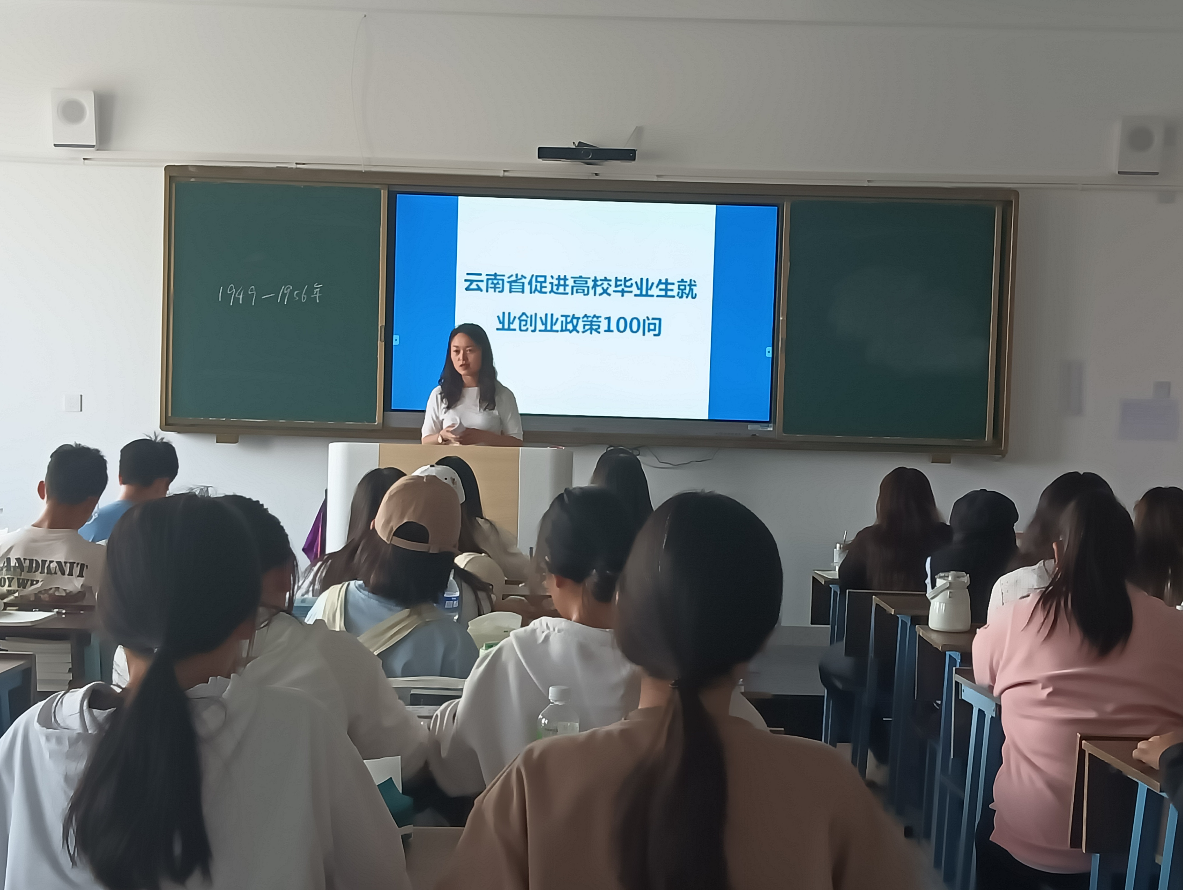 积极开展“云南省促进高校毕业生就业创业知识 100 问”系列宣传活动。职规课教师通过课堂时间对学生提问、现场实操就业答题等方式促进同学们学习就业创业政策,指导做好职业规划发展;毕业班召开线上主题班会,对云南省就业创业100问相关内容进行传达,指导毕业生树立正确就业观念、积极参与招聘会、投递简历;学生会通过趣味问答方式,介绍基层就业、企业就业、应征入伍、科研助理、自主创业、见习培训和服务援助等就业创业政策。