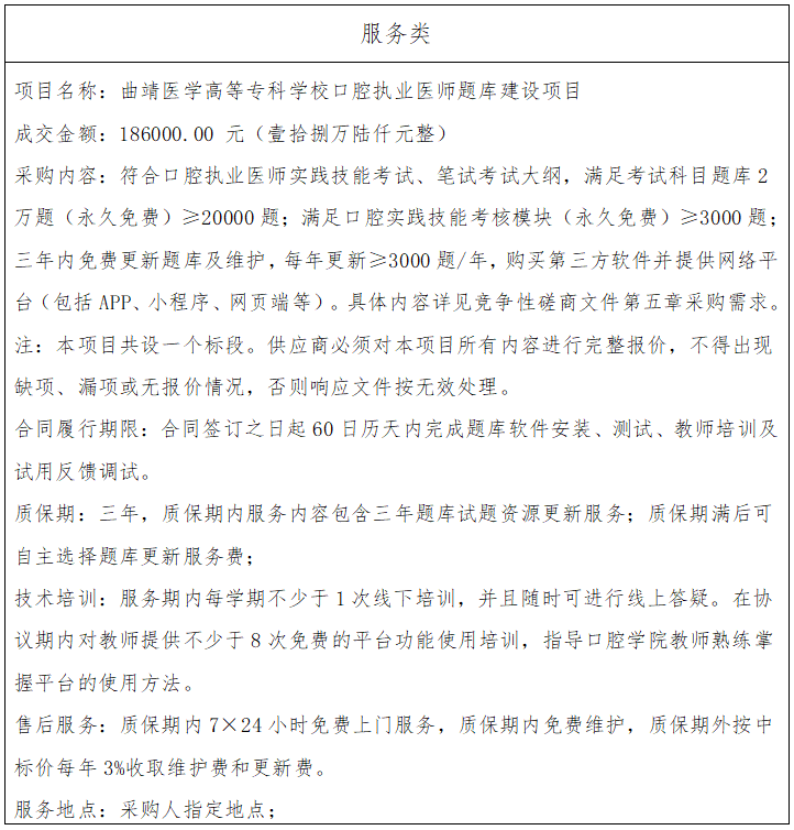二、项目名称:曲靖医学高等专科学校口腔执业医师题库建设项目