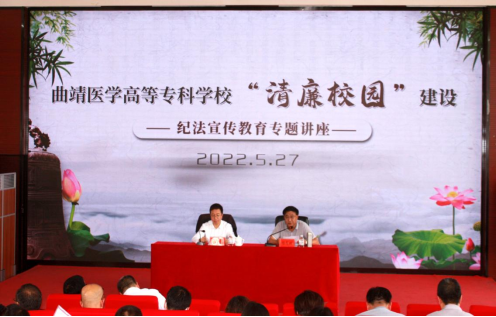 为推动全面从严治党向纵深发展,进一步强化广大教职员工的纪律规矩意识,提升法治思想,共创“政风清明、校风清净、教风清正、学风清朗、家风清廉”的清廉校园。5月27日,学校邀请曲靖市司法局党组书记、局长李四荣作关于曲靖医学高等专科学校“清廉校园”建设——纪法宣传教育专题讲座。学校党政领导班子出席会议、全校教职工参加学习。会议由党委副书记桂发权主持。